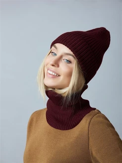 Шапка женская бини вязаная с отворотом бордовая