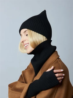 Шапка женская бини вязаная с отворотом черная