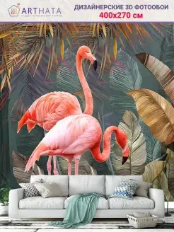 Фотообои Розовый фламинго 400х270см. Тропические листья, пти…