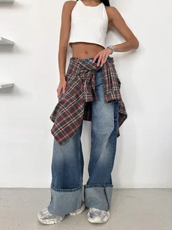 Джинсы широкие wide leg с подворотами на низкой посадке