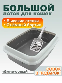 Туалет для кошек большой с бортиком и лопаткой, тёмно-серый