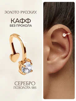 Кафф без прокола серебро 925 позолоченная моносерьга