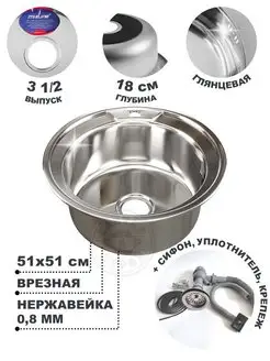 Мойка врезная круглая 51 см с сифоном