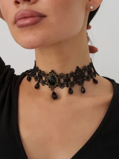 Чокер черный кружевной плетеный широкий с бусинами бижутерия