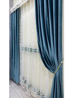 Портьеры бархатные бирюзовые с вензелями, ширина 4м