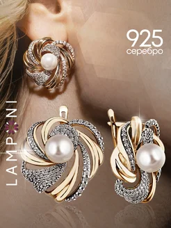 Серьги позолоченные серебро 925 крупные фианит и жемчуг