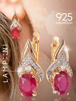 Серьги позолоченные серебро 925 с большим камнем рубин