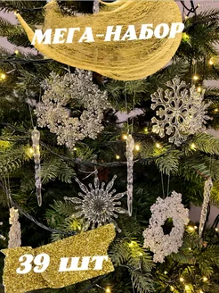 Большой набор елочных игрушек Сосульки и Снежинки 39 шт