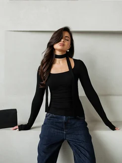 Лонгслив облегающий с вырезом и шарфом