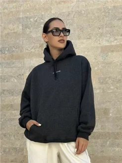 Серое худи оверсайз с начесом принтом и капюшоном