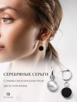 Двухсторонние серьги серебро 925 с ониксом и перламутром