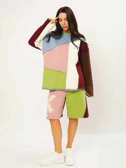 Лонгслив дизайнерский разноцветный в стиле пэчворк оверсайз