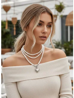 Колье многослойное Heart Charm жемчужное, кулон сердце