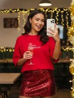 Красная Футболка оверсайз с вышивкой mood Prosecco