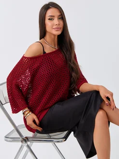 Кофта сетка бордовая оверсайз вязаная накидка на платье