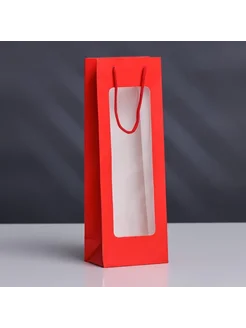 Подарочный пакет под бутылку с окном красный 36 см, 12 шт