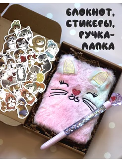 Подарочный пушистый меховой блокнот с ручкой лапкой котика