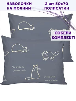 Наволочка 50х70 на молнии 2шт полисатин Котики на сером