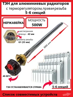 ТЭН 500W для алюминиевых радиаторов с термостатом, правая р