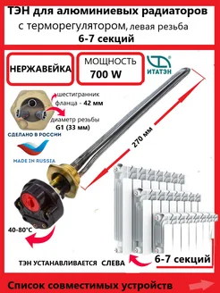 ТЭН 700W для алюминиевых радиаторов с термостатом, левая р