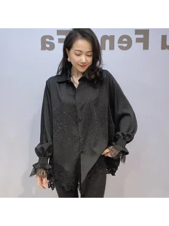 Нарядная блузка-рубашка оверсайз с кружевом и стразами