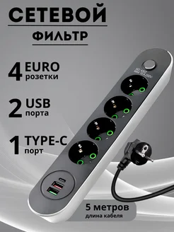 Сетевой фильтр Удлинитель 5 метра с USB и TYPE-C