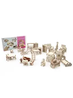 Большой деревянный кукольный домик с фиолетовой мебелью