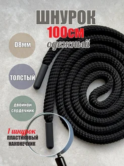Шнурок для одежды 100см черный 8мм наконечник СИЛИКОН