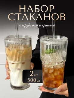 Набор больших стаканов эстетичных 2шт с крышкой и трубочкой