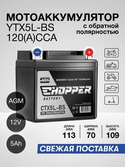 Аккумулятор для мотоцикла AGM 12В 5Ач СТ1205, YTX5L-BS
