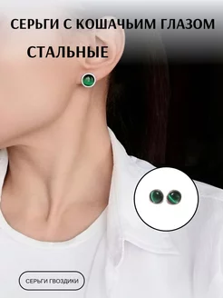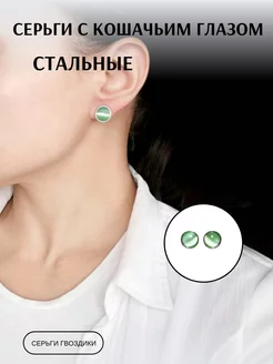 Серьги гвоздики стальные с кошачьим глазом гипоаллергенные