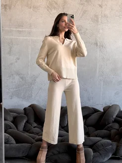 Вязаный костюм теплый джемпер поло с брюками в рубчик