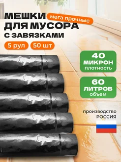 Мешки для мусора 60 л прочные черные с завязками