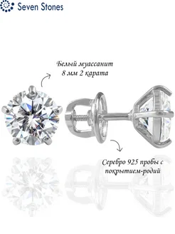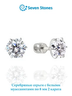 Серебряные серьги с белыми муассанитами по 2 карата, 8 мм