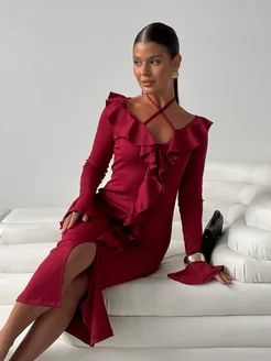 Платье трикотажное миди вечернее с воланами