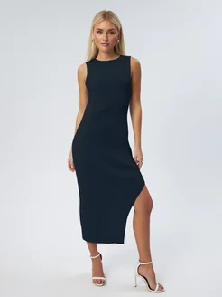 Платье трикотажное лапша в рубчик с разрезом на ноге