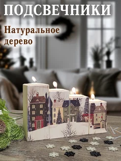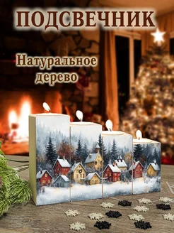 Подсвечник деревянный с новогодним принтом под чайную свечу