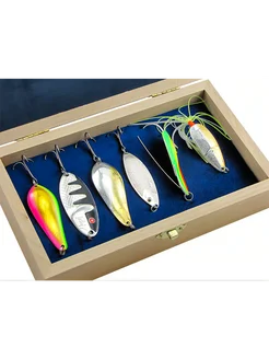 Набор латунных блесен в золоте и серебре №12 в дереве, 6шт