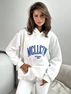 Худи белое женское на флисе с капюшоном принтом оверсайз