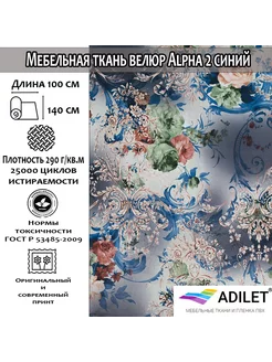 Ткань мебельная, Велюр Alpha 2 синий цветы 1 метр