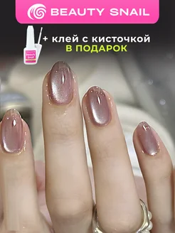 Накладные ногти с клеем и дизайном кошачий глаз короткие