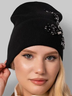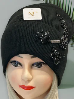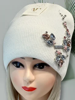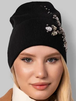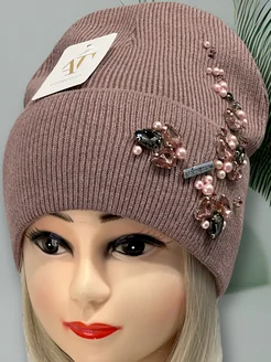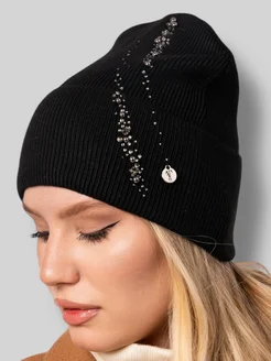 Шапка осенняя-весенняя вязаная с камнями стразами бини