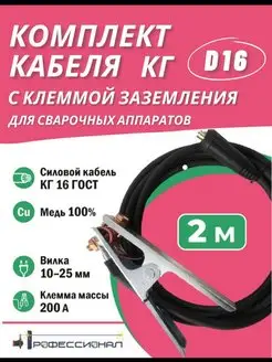 Сварочный кабель КГ 16 мм комплект с клеммой заземления 2 м