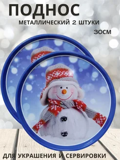 Два подноса круглых металлических "Снеговик"