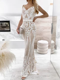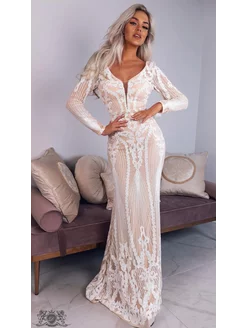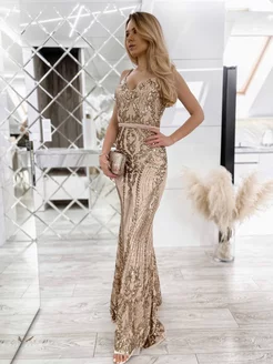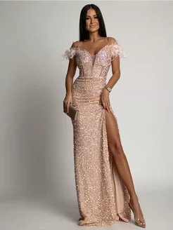 пудровое макси платье с перьями и пайетками + PLUS SIZE