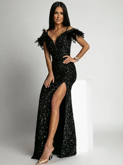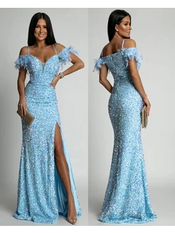 голубое макси платье с перьями и пайетками + PLUS SIZE