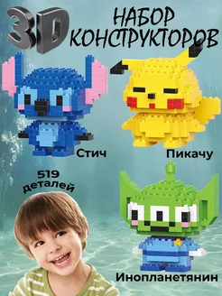 3д конструктор из миниблоков Пикачу, Стич, Инопланетянин