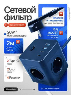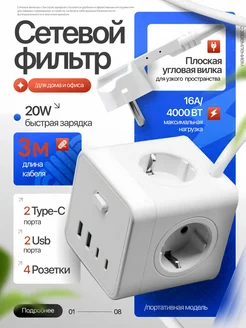 Сетевой фильтр 4 розетки с USB, Type-c и ночником