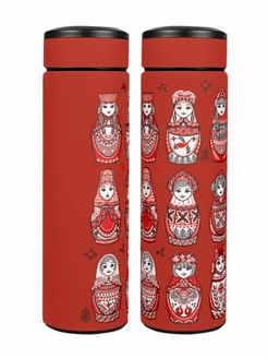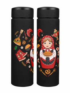 Термос черный для чая вакуумный 0,5 л. с принтом "Матрешка