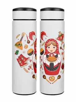 Термос белый для чая вакуумный 0,5 л. с принтом "Матрешка